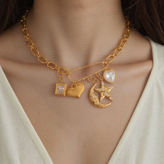 PRE-MADE Lunar Love Charm Necklace – Gold Crescent & Heart Details