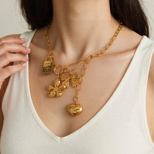 PRE-MADE Eternal Love Charm Necklace – Gold Heart & Rose Symbols
