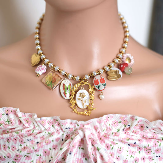 Butterfly Pearl Necklace with Heart Charm - Elegant White & Gold Pendant