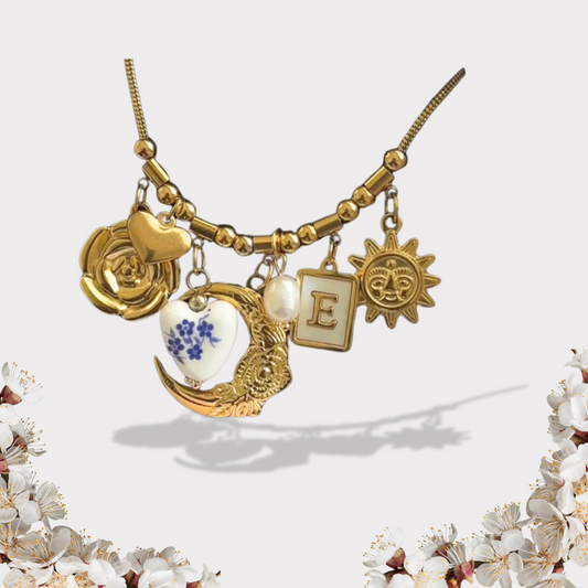 Personalized Gold Moon and Blue heart china vintage Necklace-customization